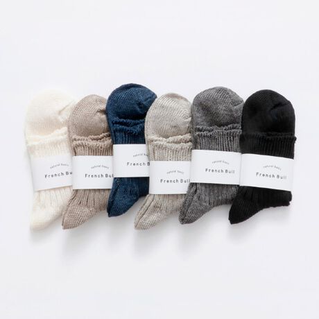リネン糸をざっくりと編み立てた、透け感のある程よい厚みでくるぶしが隠れる短めの丈です。