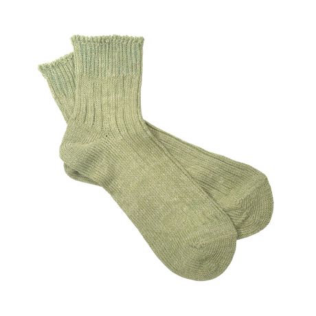 リネン糸をざっくりと編み立てた、透け感のある程よい厚みでくるぶしが隠れる短めの丈です。