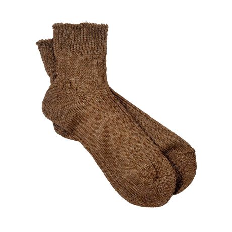 リネン糸をざっくりと編み立てた、透け感のある程よい厚みでくるぶしが隠れる短めの丈です。