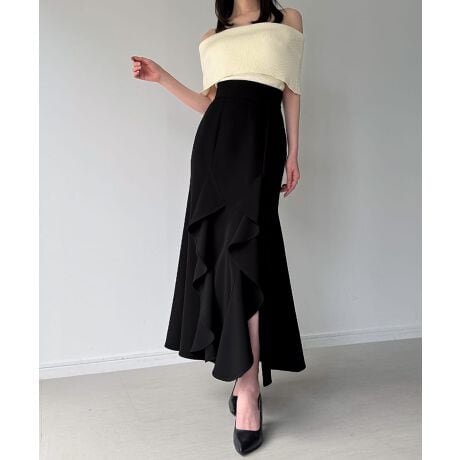 ハイウエストスリットフリルマーメイドスカート(薄手、裏地無し)