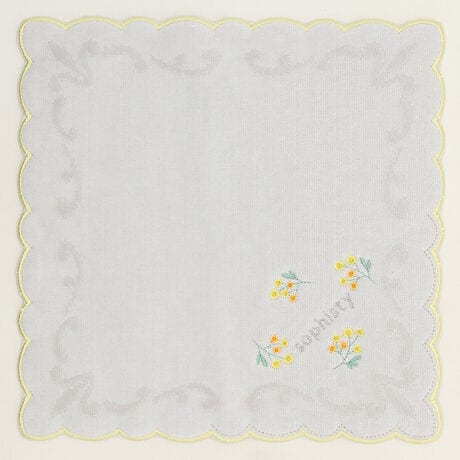 可憐なミモザが刺繍されたタオルハンカチです。エレガントな雰囲気の漂う上品な一枚はギフトにも最適です。
