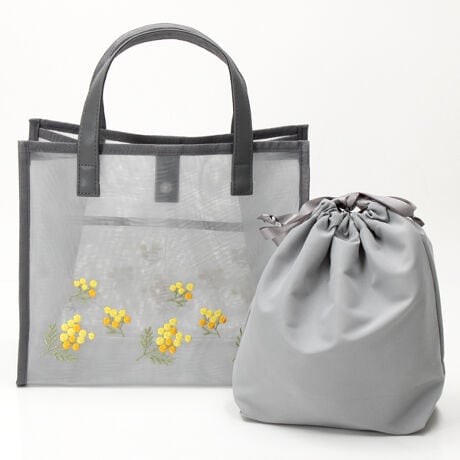 可憐なミモザが刺繍されたメッシュ素材のトートバッグです。内側には小物や携帯を入れるのに便利なポケットが二つ付いています。付属の巾着に収納すれば透けを気にせず持ち運べます。