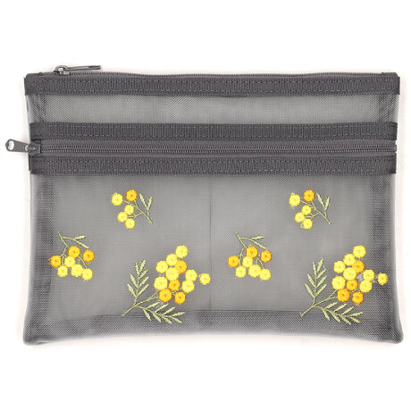 可憐なミモザが刺繍されたメッシュ素材のダブルファスナーポーチです。背面には平ポケットが二つ付いています。コスメだけでなく、手帳やカード類、文具を持ち運ぶのにも便利です。