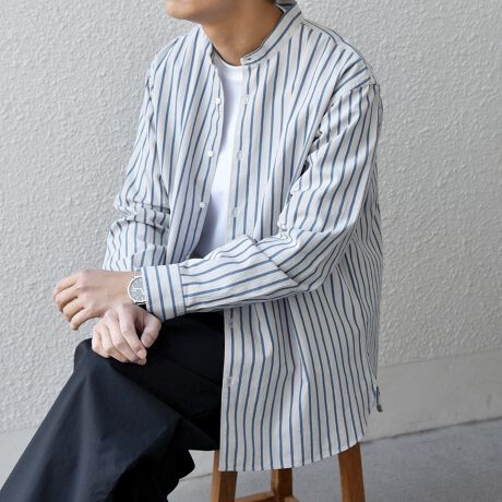 コットン×リネン素材で春夏にピッタリ!カラー毎に異なるストライプ柄を採用したバンドカラーシャツ