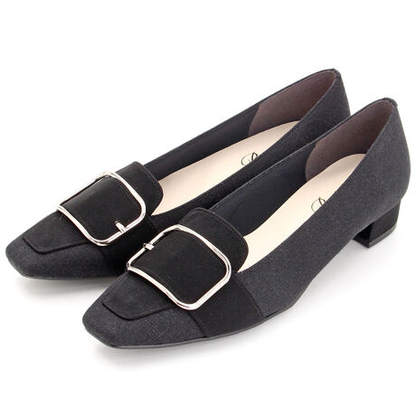 スクエアバックルでレトロ感のある、ローヒールパンプス