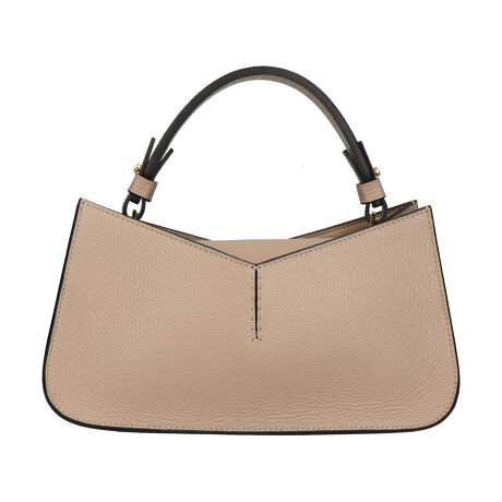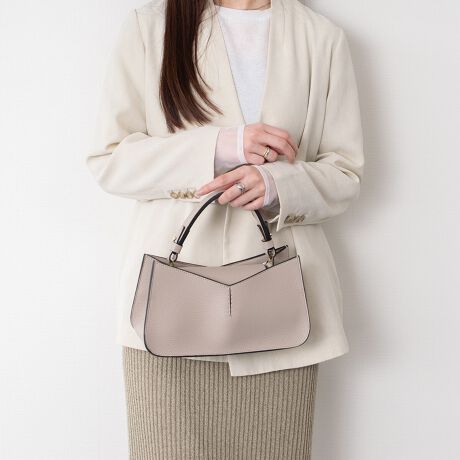 静かに洗練された存在感をまとう、ライトベージュのハンドバッグ。Vラインが生み出す立体的なアクセントが、シンプルなフォルムが上質な印象を与えます。