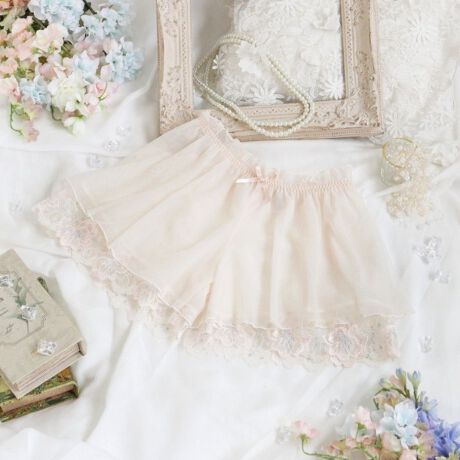 水彩画のように淡い大輪の花々が咲きほこる、優美なシリーズです。裾のレースにはサーモカット手法をあしらい、素肌に描いたような透明感を演出。その上からシアーなチュールレースを重ねることで、軽やかで繊細なニュアンスを添えました。ふんだんにほどこされたラメ糸は光を受けるたびにきらめき、華やかでラグジュアリーな印象を与えてくれます。ウエストゴムにはギャザーチュールをほどこし、女性らしい可愛らしさに仕上がりました。見る人を惹きつけるような繊細さと豪華さを兼ね備えた、特別感あふれるコレクションです。