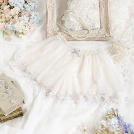 水彩画のように淡い大輪の花々が咲きほこる、優美なシリーズです。裾のレースにはサーモカット手法をあしらい、素肌に描いたような透明感を演出。その上からシアーなチュールレースを重ねることで、軽やかで繊細なニュアンスを添えました。ふんだんにほどこされたラメ糸は光を受けるたびにきらめき、華やかでラグジュアリーな印象を与えてくれます。ウエストゴムにはギャザーチュールをほどこし、女性らしい可愛らしさに仕上がりました。見る人を惹きつけるような繊細さと豪華さを兼ね備えた、特別感あふれるコレクションです。