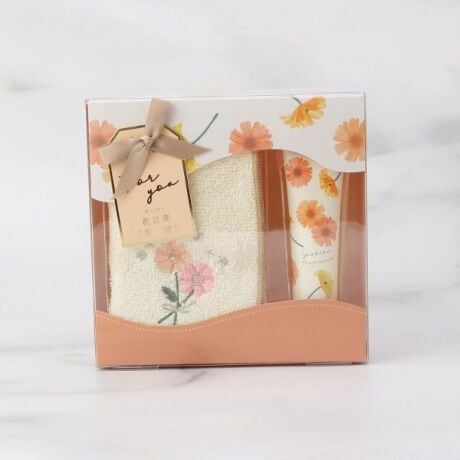 ハンドクリーム30gと刺繍入りタオルハンカチとのセット。