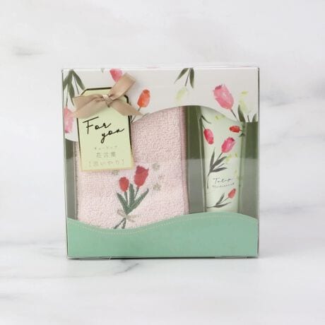 ハンドクリーム30gと刺繍入りタオルハンカチとのセット。