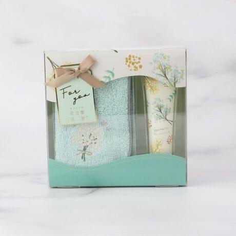 ハンドクリーム30gと刺繍入りタオルハンカチとのセット。