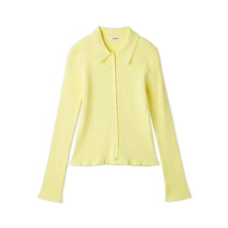 襟元にあしらったレースが上品なアクセントになるカーディガン。