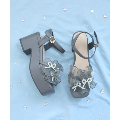 シアーフリルにパールリボンをプラスしたフェミニンムード高まるサンダル。