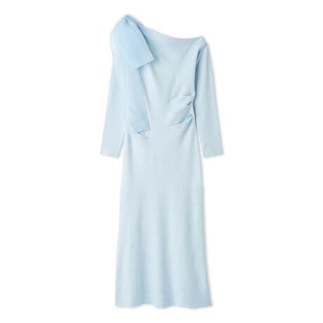 肩のオーガンジーリボンが女性らしさを引き立てるワンショルニットワンピース。