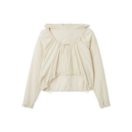 心地よい高機能な素材を使用したアノラックタイプのブラウス。くしゅくしゅとギャザーが入った胸元と裾と大きなフードがポイントの1枚。フードも大きめにしており、シンプルながらデティールにこだわりを。袖にはベルクロの代わりにアウトドアでブランドで使用されるブロックテーピーを使用。水際でも着ていただけるように水はけのよいものに。機能的にもラッシュガードとして着用いただくことも可能。