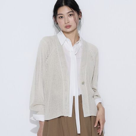 ボトムス次第でカジュアルからきれいめまで、自在にコーディネートしやすいドライアタッチのニットカーディガンです。
