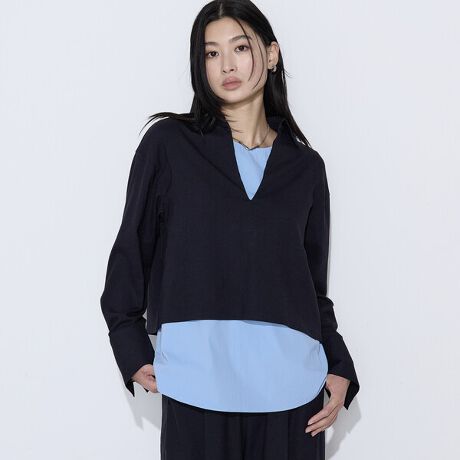 シャツ地のタンクトップにスキッパータイプのプルオーバーを重ねた手軽にレイヤードが楽しめるアンサンブルです。