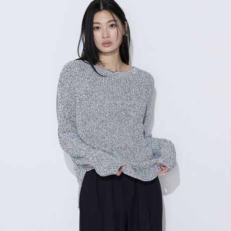 ミドルゲージの片畦編みに、タックを組み合わせたざっくり編みが軽さを感じさせるドライタッチなプルオーバーです。