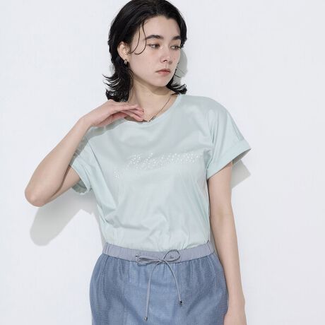 トレンドパールをジュエリー感覚で楽しむ上品Tシャツでフロントに施したBlossomのパールホットフィット(熱接着)が甘すぎない大人の華やぎを演出します。