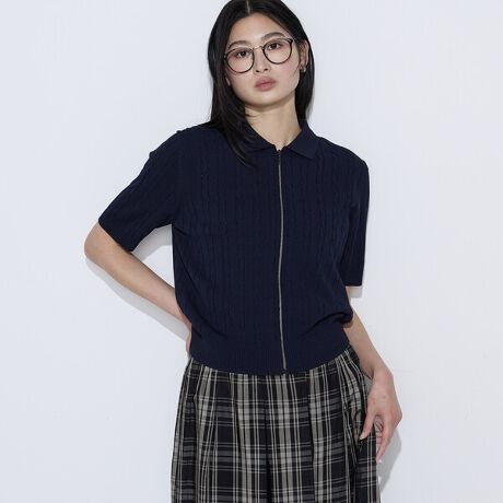 定番のワイドリブに大きめのケーブルを掛け合わせた襟付きジップカーディガンです。