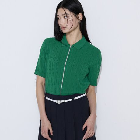大きめのケーブルとポロ襟がトラッドなムードを引き立つアイテムです。
