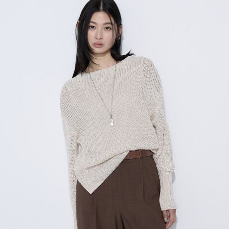 ミドルゲージの片畦編みに、タックを組み合わせたざっくり編みが軽さを感じさせるドライタッチなプルオーバーです。