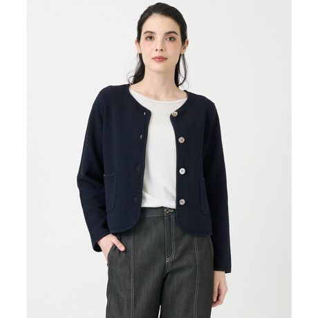 変形カノコ編みによる表面変化、微光沢があって上品見えするニットジャケット。