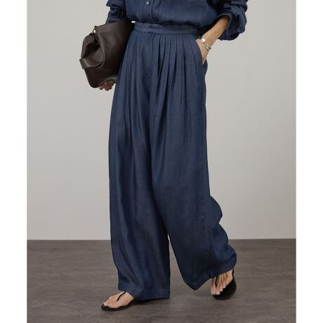フロントに多数のタックを施した、ニュアンスのあるワイドシルエットのパンツ。