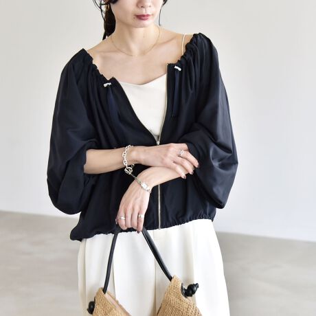 ジップを閉めればブラウス感覚として、開ければカーディガン感覚で軽い羽織としても活躍する2WAY仕様の一枚です。