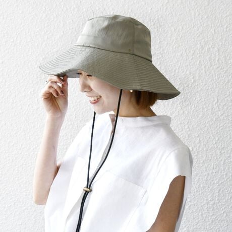 UVカットと撥水加工、接触冷感機能付きの、お出かけに最適なつば広ハット。