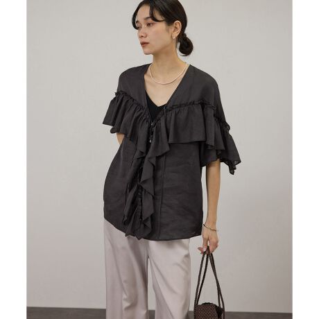 身頃から袖へ流れるようなフリルが印象的なリネンフリルブラウス。