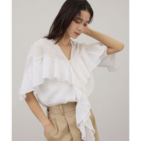 身頃から袖へ流れるようなフリルが印象的なリネンフリルブラウス。
