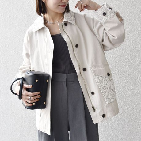 レースデディールが目を惹く、ミディ丈ジャケット。