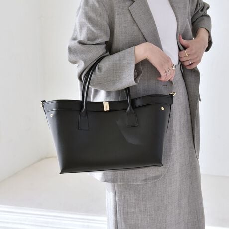 トレンドの横長シルエットと、フロントのゴールドバックルデザインがポイントのトートバッグ。