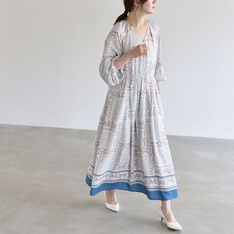 繊細な小花と幾何学模様を組み合わせたワンピース。