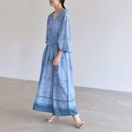 繊細な小花と幾何学模様を組み合わせたワンピース。