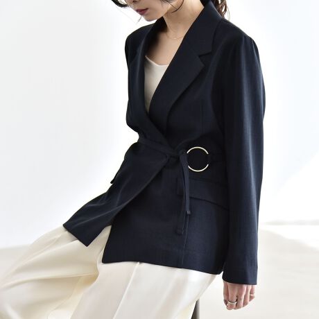 クラシカルな印象のダブルのジャケットにリングベルトが付いた、モードな雰囲気のあるジャケット。