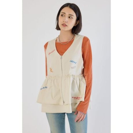 ■ポイントさらっとした素材で仕上げた春夏に使いやすいアイテム。ペプラムデザインで腰位置を高く見せてくれるので、長めの丈ながらすっきりと着用できます。ランダムに入ったメッセージ刺繍がポイント。■ディテールたっぷりとしたギャザーのティアードデザインです。フロントジップはWジップを使用しているので、コーディネートや合わせるボトムスの幅を広げてくれます。■スタイリング同素材のパンツ(420JSR30-0531embroideryフロントジップベスト)とのセットアップ着用がおすすめ。そのほかにもTシャツ+デニムのシンプルなスタイリングに取り入れるだけで一気に華やかになる万能アイテムです。■生地WHT、BLKはストレッチツイル、BLUは9ozインディゴデニムを使用。刺繍は光沢糸を使用。■透け感:なし■裏 地:なし■伸縮性:ややあり■光沢感:なし※お取り扱い上のご注意BLUは、経年劣化により色落ちが生じます。加工による裾のアタリには個体差があります。[注意事項]※画像の商品はサンプルです。実際の商品と仕様、加工が若干異なる場合があります。※画像の商品は光の照射や角度、お使いのモニター環境により、実物と色味が異なる場合がございます。※着用、お取り扱いの際は、アテンションタグをご確認ください。