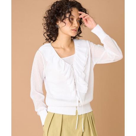 ■デザイン華やかなフリルが目を惹くニットカーディガン。ヨーロッパならではの繊細なラメ糸をデニット風に編み立てることで、ほのかにシアー感があるさらっとした着心地の一枚に仕立てました。生地を贅沢に使用した2枚仕立てのボリューミィな首周りのフリルは、少し深めのVネックですっきり見えも叶えます。フロントのリボンを結んでトップス感覚での着用がおすすめ。女性らしいディティールながら大人なカラーで今年らしいスタイリングを楽しんでいただける一着です。■素材創業140年の歴史を持つ、イタリアを代表する糸メーカーである【OLIVO】社の糸です。ヨーロッパの一流ブランドに素材を供給し続けており、高い技術と品質で知られています。非常に細番手の糸で、他には無い多彩なラメの色合いが特徴です。ラメ素材ながら柔らかな手触りで着用しやすい糸です。・水洗い可同素材のトップス品番:8062170915■下げ札サイズ表記2=(M/9号)■サンプル撮影商品画像の商品はサンプルです。実際の商品とはサイズや色味、素材、デザイン等の仕様が若干変更になる場合がございます。■カラーについては、可能な限り実際の商品に近いカラーで撮影をおこなっておりますが、照明の関係により実際の製品とは色味が違って見える場合があります。またパソコン・スマートフォンなどの環境により、若干製品と画像のカラーが異なる場合もございます。現物と画像のカラー差異については返品理由となりませんので、予めご了承ください。■サイズ表記はあくまで目安となります。