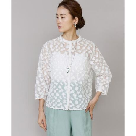 ■デザインシアー感のある表情豊かなカットジャカード素材を使用したブラウス。抜け感のあるボクシーシルエットがストレスフリーな着心地を叶える一着。シンプルなボディに、ふんわりとしたスリーブがやさしいアクセントを添え、トレンドのクロップト丈とクラシカルなくるみ釦が上品なポイントになっています。トップスとしてはもちろん、軽く羽織るアイテムとしてもお使いいただける万能なデザインです。■素材トレンド感のあるシアーな表面と、カットジャカードによる表情豊かな凹凸感、そして甘すぎない抽象的なフラワーモチーフが魅力の素材。適度なハリが立体的なシルエットを生み出し、スタイリングのアクセントになる存在感を放ちます。さらに、すっきりとした清涼感に加え、シワになりにくい扱いやすさも備えており、デイリーに取り入れやすい素材。・水洗い可同素材のワンピース品番:6961121809■サンプル撮影商品画像の商品はサンプルです。実際の商品とはサイズや色味、素材、デザイン等の仕様が若干変更になる場合がございます。■カラーについては、可能な限り実際の商品に近いカラーにて撮影をおこなっておりますが、照明の関係により実際の製品とは色味が違って見える場合があります。またパソコン・スマートフォンなどの環境により、若干製品と画像のカラーが異なる場合もございます。現物と画像のカラー差異については返品理由となりませんので、予めご了承ください。■サイズ表記はあくまで目安となります。