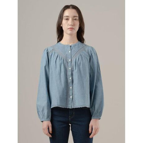 [型番:005EI0002]シンプルに装いをワンランクアップさせる、Cleo ロングスリーブブラウス。Uネックでボタン留めのフロント、そしてリラックスした着心地が魅力です。model:168cm B80 W63 H92 着用サイズ:S