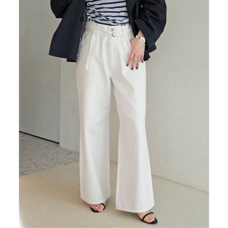 ジャストサイズですっきりと着用するのはもちろん、ワンサイズ上げて腰に引っ掛けたラフな着こなしもおすすめ。細幅のウエストベルトが程よいアクセントとなり、カジュアルながらも大人っぽい印象で楽しめる一本です。トップスを選ばず、デイリーに活躍します。