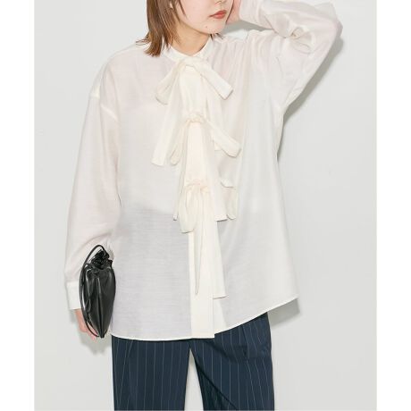 グッと華やかな印象になるリボンブラウスは、スラックスパンツなど少しメンズライクなアイテムや