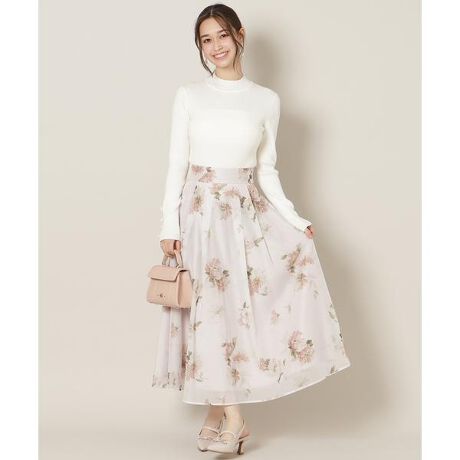 やわらかな色彩が春ムードを高める、フラワープリントシアータックスカート【Design】・キラキラとした光沢感のあるシアー生地に、水彩タッチの柔らかなフラワーモチーフが春らしさを高めてくれるスカート。・ハリ感のある生地をタックに仕上げる事でフワッと立体的なシルエットに。・バックスタイルはレースアップ仕様で、後ろ姿までフェミニンなアクセントをプラス。・コーディネートが華やかに決まる1枚です。・左ファスナー仕様【Fabric】・ほのかな光沢感のあるシアー素材で、軽やかで春らしい印象に。・程よいハリ感があり、シルエットをきれいに保ちます。・ご自宅でお手入れが出来るのも嬉しいポイント♪・ホワイト、ピンク、ネイビーの3色展開となります。【Care】手洗い可能