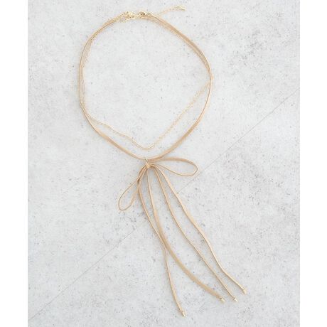 [型番:01001451000]首元でふんわり結んだ細いスエードライクのリボンが、そっと顔周りを引き立てるスエードライクリボンネックレス。結び方や長さを自在に変えられ、鉄・真鍮のメタルチップが程よいモダンさを添えます。薄手のカットソーやワンピにチョーカー風に合わせたり、細めのチェーンと重ね付けして甘さと洗練を両立させるのがおすすめです。