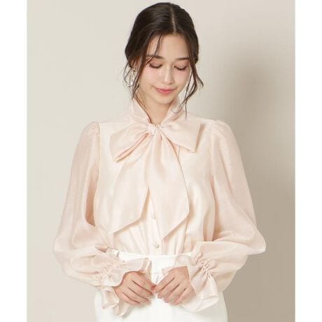 ベーシックながら華やかさをプラスした、シアーボウタイブラウスが登場♪【Design】・柔らかく軽やかな素材で、シフォンのような透け感とふんわりした着心地。・袖はキャンディースリーブで、女性らしい雰囲気でご着用いただけます。・ボタンには上品なパールをあしらい、さりげなくクラシカルなアクセントに。・ボディライン部分にはカットソー風の裏地を施しているので、着心地が◎・腕部分は裏地なしで透け感を楽しめ、軽やかで上品な印象に。・デイリーからきれいめコーデまで幅広く活躍する、1枚で華やかさを叶えるブラウスです◎【Fabic】・上質感のある、シワになりにくいポリエステル素材を使用。・ご自宅でお手入れが出来るのも嬉しいポイント♪・ホワイト、ピンク、ラベンダーの3色展開となります。【Care】手洗い可能