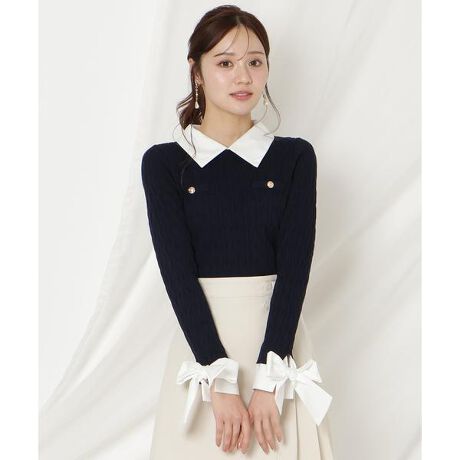 袖口のリボンカフスが目を惹く、リボンカフスドッキングケーブルニット【Design】・立体感のあるケーブル編みと、異素材をドッキングしたデザインが特徴のニットトップス。・袖口にはリボンカフスをあしらい、さりげなくフェミニンなアクセントをプラス♪・程よくコンパクトなシルエットで、イン・アウトどちらの着こなしもバランス良く決まります!・スカートにもパンツにも合わせやすく、幅広いスタイリングに対応◎・デイリーからきれいめシーンまで活躍する1枚です。【Fabric】・やわらかな風合いのニット素材で、心地よい着用感に。・異素材部分とのコントラストが、表情のある仕上がりを演出します。・ご自宅でお手入れが出来るのも嬉しいポイント♪・ホワイト、ミント、グレー、ネイビーの4色展開となります。【Care】手洗い可能