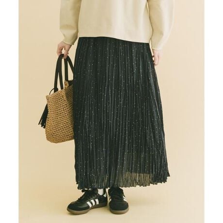 生地全体に散りばめたラメドットが、動くたびにさりげなくきらめくプリーツスカート。細かなドット柄と控えめな輝きが、装いに奥行きと上品さを添えます。腰まわりから裾にかけて施した細密プリーツが縦のラインを強調し、すっきりとした落ち感のあるシルエットに。ウエストは総ゴム仕様で、見た目のきれいさと快適な穿き心地を両立しました。華やかさがありながら主張しすぎず、日常のスタイルに自然になじむ一着です。