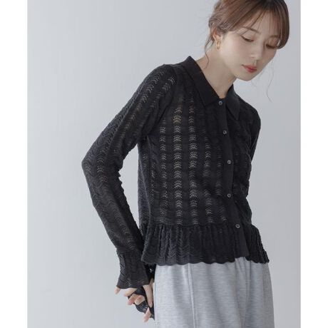 レースのように繊細に編まれた模様が目を惹くシャツ型ニット。