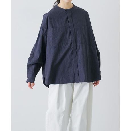 羽織りとしても活躍する前開きのシャツ。ワイドシルエットとコンパクトな首元が抜け感をもたらしています。身幅はたっぷりとしていて、上半身のラインを拾わず着心地の良いサイズ感。ボタンが見えない比翼仕様とヨークが無いミニマルなムード。生地は程よくハリがあるコットンリネンを使用しています。新しい季節を感じさせるカラー展開にも注目です。